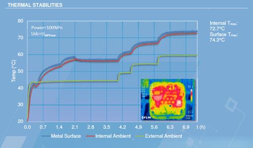 代表機型2:S廠商逆變器。逆變器內(nèi)部溫度比機箱外殼溫度高15度左右,在環(huán)境溫度45度條件下,內(nèi)部溫度約70度;