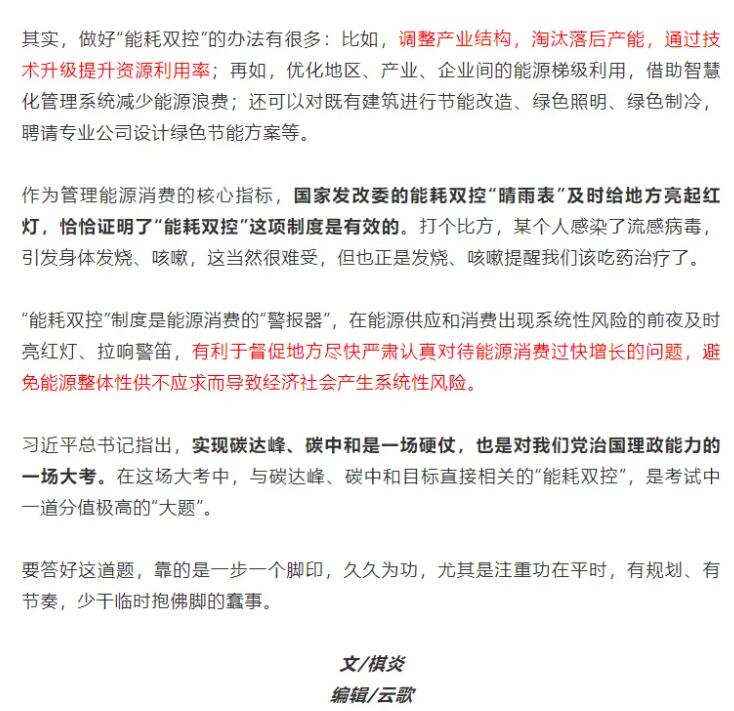 編者按:9月11日,國家發(fā)展改革委印發(fā)《完善能源消費強度和總量雙控制度方案》,要求各地政府以能源資源配置更加合理、利用效率大幅提高為導向,以建立科學管理制度為手段,以提升基礎能力為支撐,強化和完善能耗雙控制度,深化能源生產(chǎn)和消費革命,推進能源總量管理、科學配置、全面節(jié)約,推動能源清潔低碳安全高效利用,倒逼產(chǎn)業(yè)結構、能源結構調(diào)整,助力實現(xiàn)碳達峰、碳中和目標,促進經(jīng)濟社會發(fā)展全面綠色轉型和生態(tài)文明建設實現(xiàn)新進步。