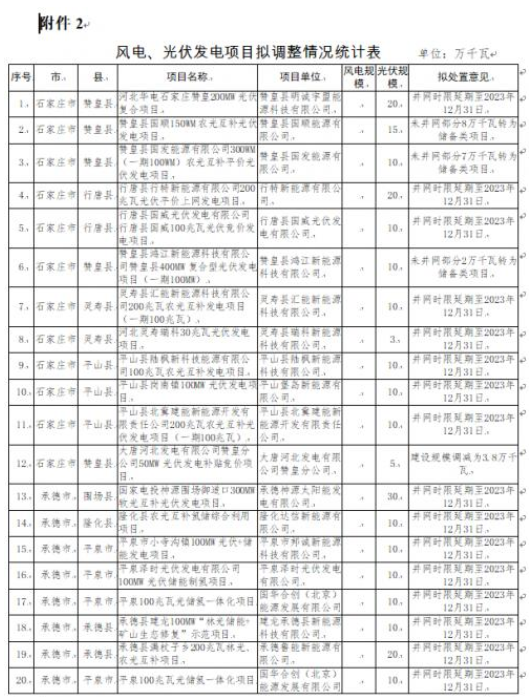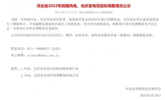 4月18日,河北省發(fā)改委對2022年到期風電、光伏發(fā)電項目擬調整情況進行公示。公示表示,為進一步加強風電、光伏發(fā)電項目管理,對2022年底已到期風電、光伏發(fā)電項目建設進度進行了摸底統(tǒng)計,并對逾期未建成項目提出了處置意見。其中,擬取消8個風電、光伏發(fā)電項目,規(guī)模合計388MW;風電、光伏發(fā)電項目擬調整37個,規(guī)模合計4484MW,其中,光伏項目3816MW。