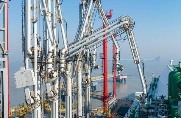 一艘LNG船靠泊在唐山港曹妃甸港區(qū)中國(guó)石油液化天然氣接收站碼頭準(zhǔn)備接卸LNG?!〖敬禾臁z