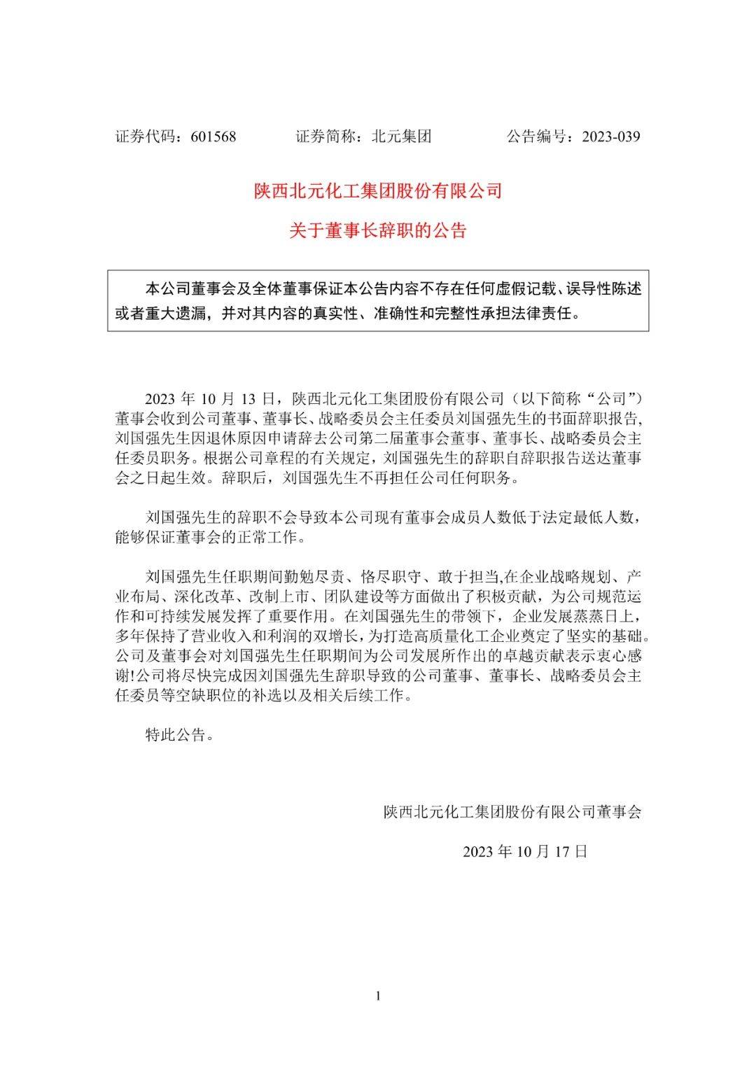 北元集團10月16日發(fā)布公告稱,10月13日,公司董事會收到董事、董事長、戰(zhàn)略委員會主任委員劉國強先生的書面辭職報告, 劉國強因退休原因申請辭去公司第二屆董事會董事、董事長、戰(zhàn)略委員會主任委員職務。