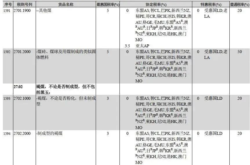 稅則顯示,2024年1月1日起,恢復(fù)煤炭進(jìn)口關(guān)稅。普通稅率為20%;特惠稅率為0;協(xié)定稅率基本為0;最惠國(guó)稅率中,無(wú)煙煤、煉焦煤、褐煤為3%,其他煤為6%。