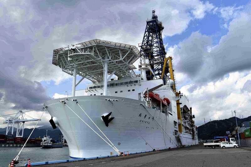 2018年10月,在靜岡清水港的地球深部探測船“地球”號(Chikyu)。 圖片來源:日本時報網站