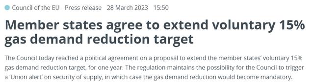 為應(yīng)對能源危機(jī),歐盟成員國當(dāng)?shù)貢r(shí)間3月28日達(dá)成協(xié)議,同意將“自愿減少15%天然氣消費(fèi)的計(jì)劃”延長一年。