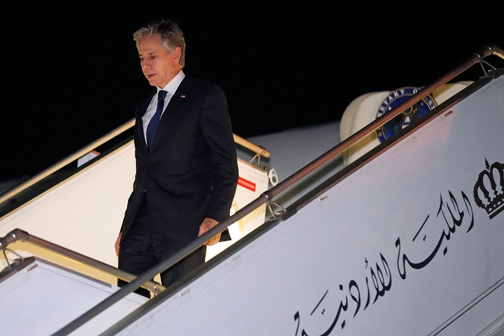 當(dāng)?shù)貢r(shí)間2023年10月17日,約旦安曼,美國(guó)國(guó)務(wù)卿安東尼·布林肯走下飛機(jī)。