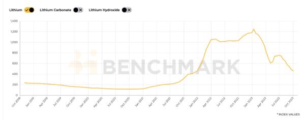 從2018年10月至今的基準(zhǔn)鋰價(jià)格指數(shù)(按市場交易量加權(quán)) 來源:Benchmark Mineral Intelligence