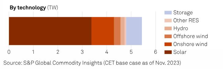 注:來(lái)自標(biāo)普全球商品洞察,從左至右依次為太陽(yáng)能、在岸風(fēng)電、海外風(fēng)電、氫能、其他可再生能源和儲(chǔ)能