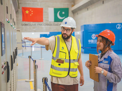 在巴基斯坦默蒂亞里—拉合爾直流輸電項(xiàng)目現(xiàn)場(chǎng),中巴工程師對(duì)設(shè)備開(kāi)展日常檢修。