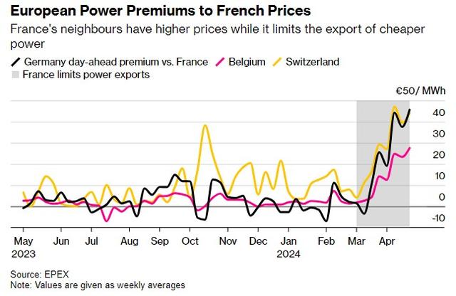 據(jù)法國電網(wǎng)運(yùn)營商RTE稱,自3月初以來,向比利時、德國、瑞士和意大利輸送電力的能力已經(jīng)減少。這使得這些國家無法進(jìn)口更便宜的法國核電,并推高了整個地區(qū)的批發(fā)價格。根據(jù)RTE的說法,這些限制應(yīng)該在5月初得到解決,但從8月中旬開始可能會有更多的限制。