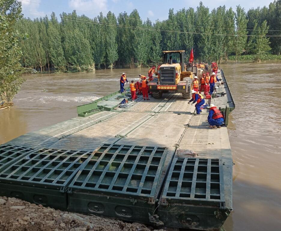 為了解決這個(gè)問題,安能三局用昨日在新鄉(xiāng)轉(zhuǎn)移被困群眾的應(yīng)急動(dòng)力舟橋,運(yùn)輸挖掘機(jī)、推土機(jī)等大型裝備以及鋼筋籠和沙袋至決口右岸,今天又再一次立下大功。