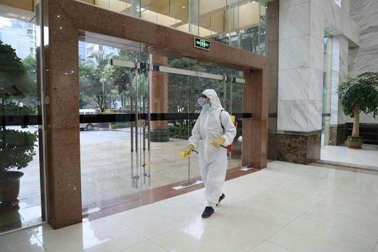 國網(wǎng)重慶北碚供電公司后勤人員對辦公大樓進行殺菌消毒