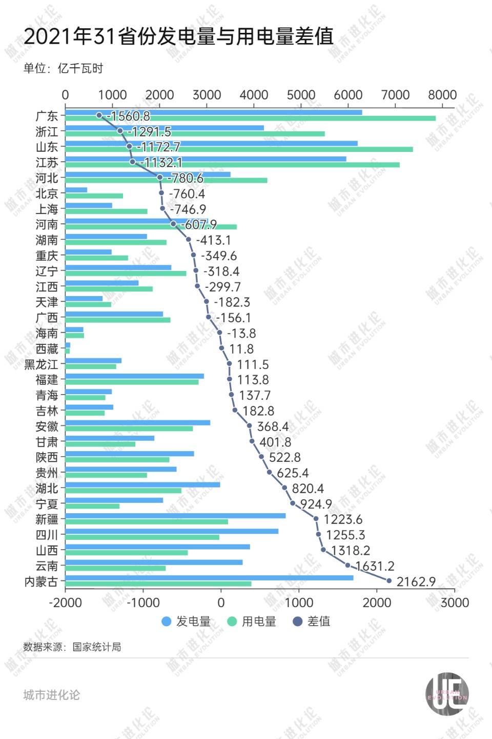 若以“發(fā)電量-用電量”來評估各省份發(fā)電凈貢獻(xiàn)和電力缺口,2022年,山東的差值為-1836.4億千瓦時(shí),凈貢獻(xiàn)從前一年全國倒數(shù)第三跌至倒數(shù)第一。