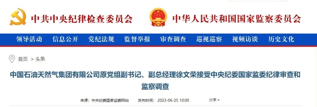 中央紀(jì)委國(guó)家監(jiān)委網(wǎng)站6月25日消息,中國(guó)石油天然氣集團(tuán)有限公司原黨組副書記、副總經(jīng)理徐文榮接受中央紀(jì)委國(guó)家監(jiān)委紀(jì)律審查和監(jiān)察調(diào)查。