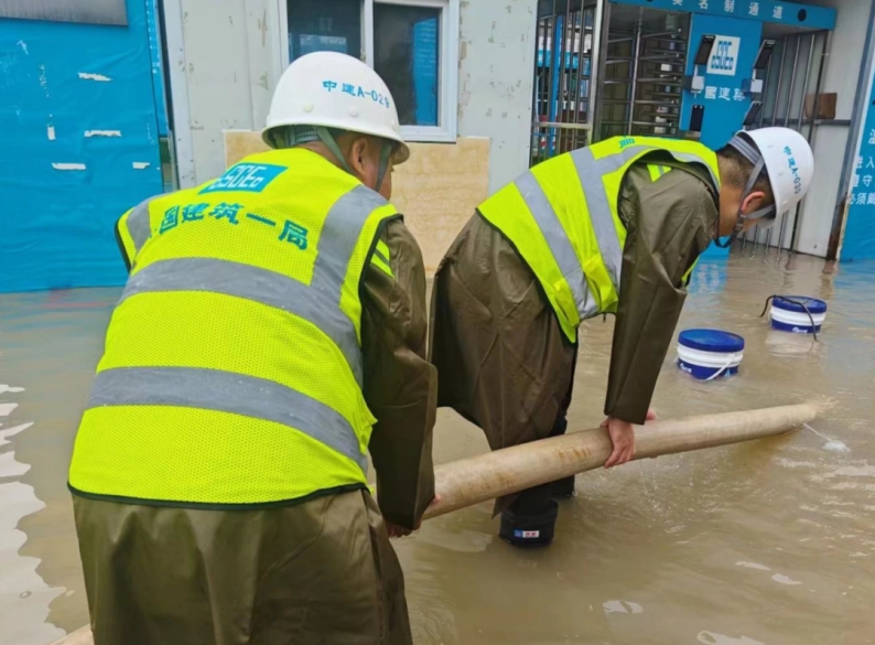 中建一局所屬在京項(xiàng)目通過(guò)壘筑防洪沙袋、運(yùn)轉(zhuǎn)大功率抽水機(jī)緊急排水、夜間組織人員通宵值班巡查等舉措,全力搶救物資,把損失降到最低,并配備防汛沙袋、塑料布以及水泵、挖機(jī)等進(jìn)行排水防汛,確保安全度過(guò)汛期。