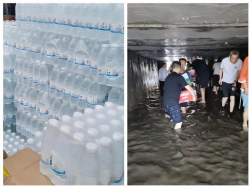 中化局物資籌措隊在涿州市分散采購礦泉水、干糧、充電寶、蠟燭等急需物資,密切關(guān)注交通運輸路況信息,第一時間打通物資通道。黨員干部和志愿者組成“人鏈”,手抱肩扛運送保障物資,搶時間、不停歇,保證基地群眾特別是離退休老職工家庭飲用水。