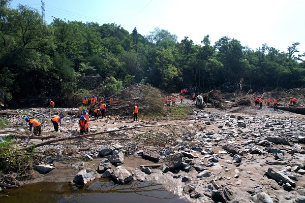 受臺(tái)風(fēng)“杜蘇芮”影響,門頭溝區(qū)遭遇極端降雨災(zāi)害,轄區(qū)河道水庫塘壩內(nèi)出現(xiàn)大量倒伏枯死林木、垃圾、建筑殘骸、車輛、淤泥,嚴(yán)重污染河湖環(huán)境,阻礙河道行洪。8月16日,中國能建葛洲壩集團(tuán)五家參建單位派出320余人,挖掘機(jī)32臺(tái)、鏟車12輛、油鋸120把、吊車5臺(tái)、運(yùn)輸車25輛,擔(dān)負(fù)門頭溝12.9公里的河道清淤、樹木清理等任務(wù)。