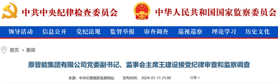 中央紀委國家監(jiān)委網(wǎng)站1月11日消息,據(jù)山西省紀委監(jiān)委消息:原晉能集團有限公司黨委副書記、監(jiān)事會主席王建設涉嫌嚴重違紀違法,目前正接受山西省紀委監(jiān)委紀律審查和監(jiān)察調(diào)查。