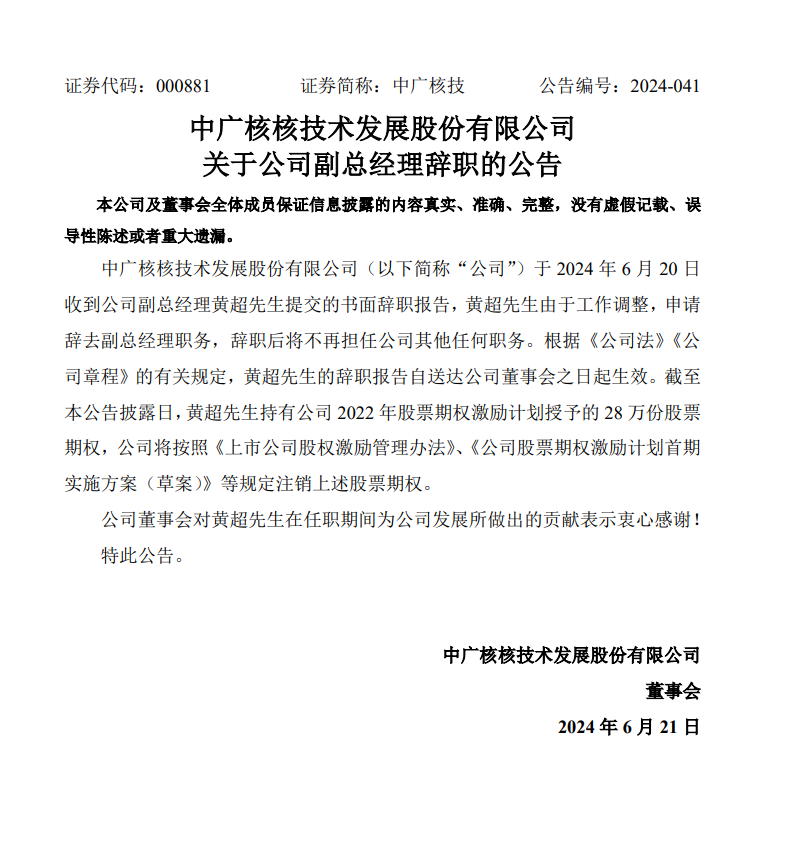 6月21日,中廣核技發(fā)布公告稱,公司于6月20日收到公司副總經(jīng)理黃超先生提交的書面辭職報告,黃超先生由于工作調(diào)整,申請辭去副總經(jīng)理職務(wù),辭職后將不再擔任公司其他任何職務(wù)。