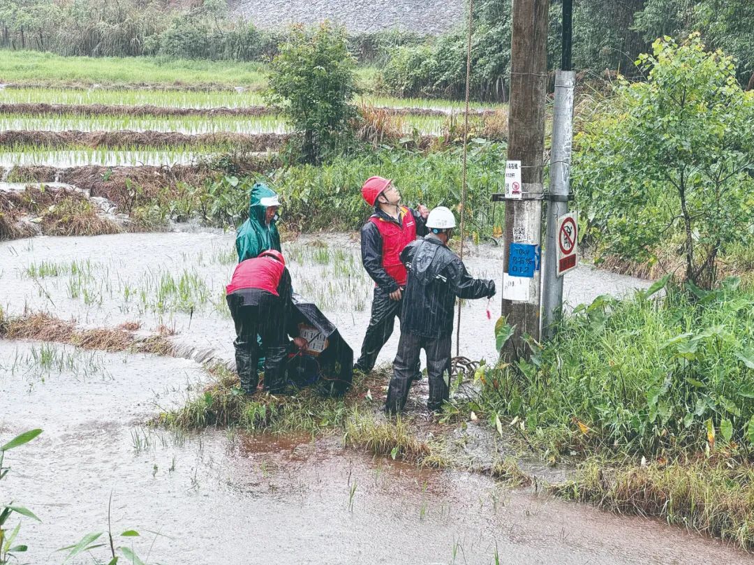 ▲圖為6月17日,國網(wǎng)福建永定區(qū)供電公司支援搶修隊伍對上杭縣10千伏稔洪線電桿傾斜現(xiàn)場開展搶修工作。黃小芬/攝