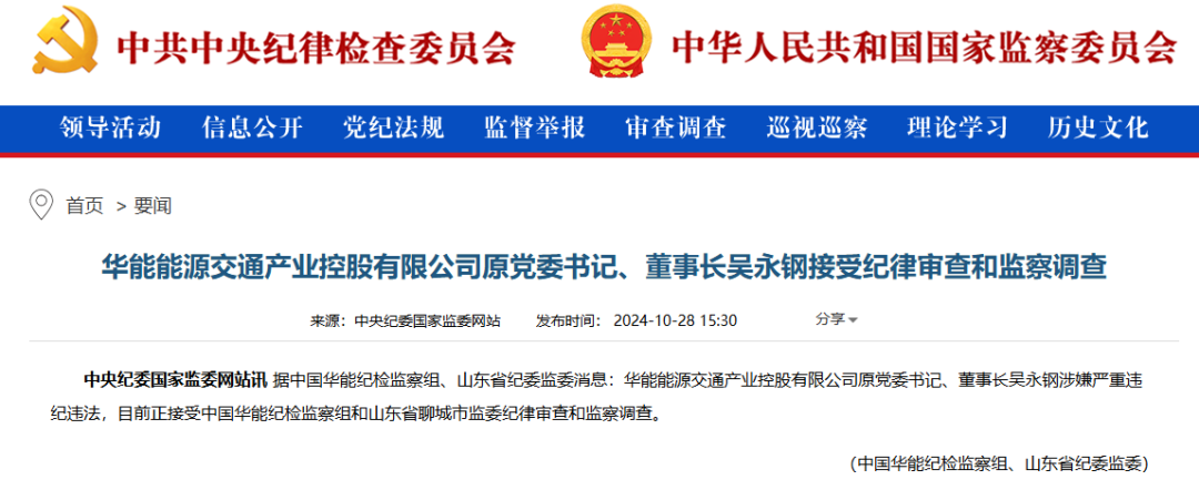 據(jù)中國華能紀(jì)檢監(jiān)察組、山東省紀(jì)委監(jiān)委消息:華能能源交通產(chǎn)業(yè)控股有限公司原黨委書記、董事長吳永鋼涉嫌嚴(yán)重違紀(jì)違法,目前正接受中國華能紀(jì)檢監(jiān)察組和山東省聊城市監(jiān)委紀(jì)律審查和監(jiān)察調(diào)查。