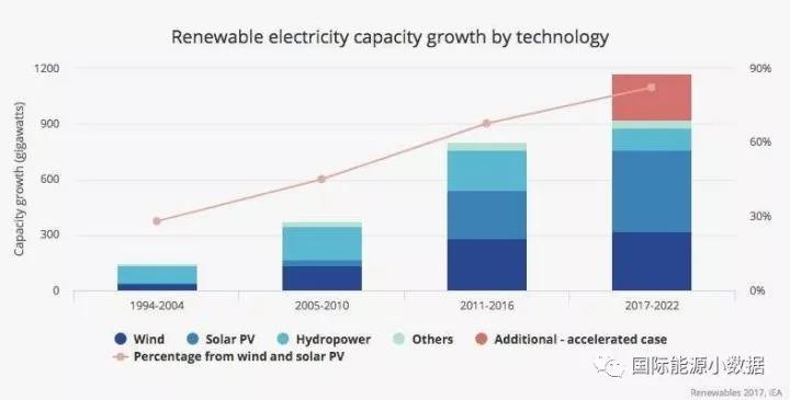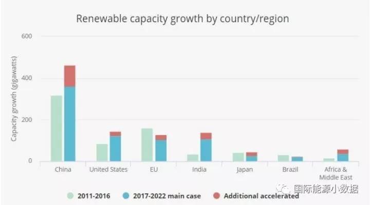 過去對(duì)于可再生能源發(fā)展規(guī)模預(yù)測曾經(jīng)偏保守的IEA現(xiàn)在預(yù)測,2017-2022年間全球可再生能源新增裝機(jī)將至少達(dá)到920吉瓦(其中風(fēng)電321吉瓦、光伏438吉瓦),其中363吉瓦(39%)將來自中國。如果各國政策支持力度加大的樂觀情形下,2017-2022年間可再生能源新增裝機(jī)可能達(dá)到1150吉瓦,其中464吉瓦(40%)來自中國。