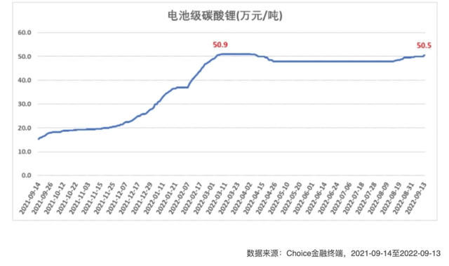 此外,此輪新能源汽車的價(jià)格上漲還和新能源汽車上游原材料價(jià)格的上漲有關(guān)。目前,中國(guó)市場(chǎng)電池級(jí)碳酸鋰價(jià)格已從2021年初的6萬(wàn)元/噸上漲到近期的50萬(wàn)元/噸。