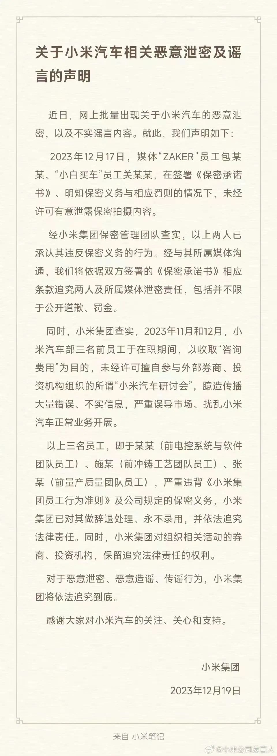 《聲明》稱,2023年12月17日,媒體“ZAKER”員工包某某、“小白買車”員工關(guān)某某,在簽署《保密承諾書》、明知保密義務(wù)與相應罰則的情況下,未經(jīng)許可有意泄露保密拍攝內(nèi)容。經(jīng)小米集團保密管理團隊查實,以上兩人已承認其違反保密義務(wù)的行為。經(jīng)與其所屬媒體溝通,小米集團將依據(jù)雙方簽署的《保密承諾書》相應條款追究兩人及所屬媒體泄密責任,包括并不限于公開道歉、罰金。另外,《聲明》介紹,2023年11月和12月,小米汽車部三名前員工于在職期間,以收取“咨詢費用”為目的,未經(jīng)許可擅自參與外部券商、投資機構(gòu)組織的所謂“小米汽車研討會”,臆造傳播大量錯誤、不實信息,嚴重誤導市場、擾亂小米汽車正常業(yè)務(wù)開展。以上三名員工,即于某某(前電控系統(tǒng)與軟件團隊員工)、施某(前沖鑄工藝團隊員工)、張某(前量產(chǎn)質(zhì)量團隊員工),嚴重違背《小米集團員工行為準則》及公司規(guī)定的保密義務(wù),小米集團已對其做辭退處理、永不錄用,并依法追究法律責任。同時,小米集團表示,對組織相關(guān)活動的券商、投資機會,保留追究法律責任的權(quán)利。小米汽車始終吸引市場高度關(guān)注,這也不是小米集團第一次遭遇汽車泄密。今年1月22日,小米汽車合作方北京某模塑科技有限公司因?qū)ζ湎掠喂坦芾聿簧疲孤读诵∶灼嚽昂蟊kU杠的早期設(shè)計稿。“小米公司發(fā)言人”微博今年2月更新了該泄密事件的處理結(jié)果:小米集團表示,已依據(jù)《保密協(xié)議》對涉事合作方進行了嚴肅處理,包括依照《保密協(xié)議》處以100萬元的經(jīng)濟賠償;責成其對下游供應商加強信息安全管理,并對泄密肇事人進行嚴肅處理;責成供應商制定詳細整改方案,全面升級保密措施。