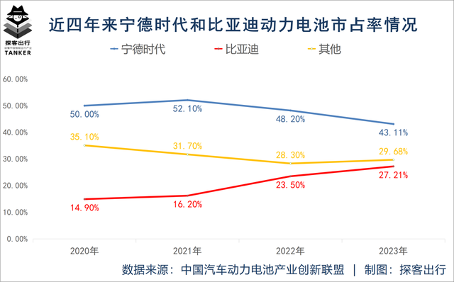 雖說,寧德時代在2023年國內(nèi)動力電池市場的市占率位居全行業(yè)第一,高達43.11%,但相比于2021年高達52.10%的市占率,已經(jīng)出現(xiàn)了明顯下滑。