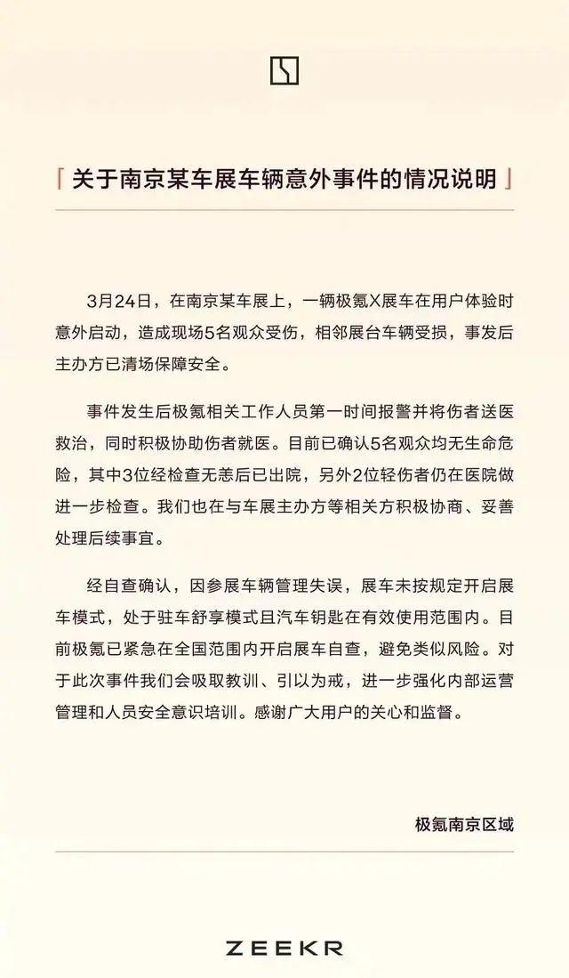 針對此次意外事件,極氪官方微博@極氪ZEEKR 于3月24日22時09分發(fā)布《關(guān)于南京某車展車輛意外事件的情況說明》。