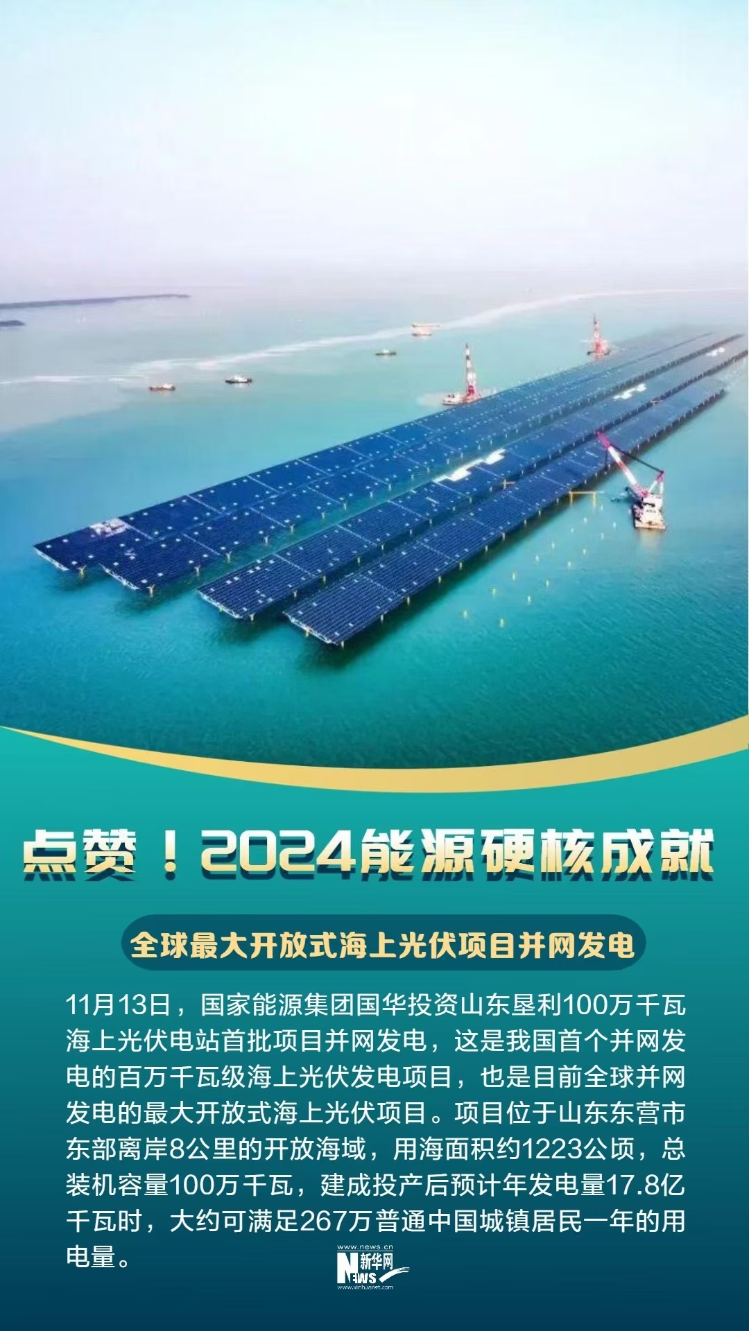 11月13日,國家能源集團國華投資山東墾利100萬千瓦海上光伏電站首批項目并網(wǎng)發(fā)電,這是我國首個并網(wǎng)發(fā)電的百萬千瓦級海上光伏發(fā)電項目,也是目前全球并網(wǎng)發(fā)電的最大開放式海上光伏項目。項目位于山東東營市東部離岸8公里的開放海域,用海面積約1223公頃,總裝機容量100萬千瓦,建成投產(chǎn)后預(yù)計年發(fā)電量17.8億千瓦時,大約可滿足267萬普通中國城鎮(zhèn)居民一年的用電量。