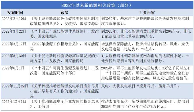 從2022年發(fā)布的新能源相關(guān)政策來(lái)看,國(guó)家層面絲毫未放松對(duì)新能源產(chǎn)業(yè)的推動(dòng)。從完善能源轉(zhuǎn)型基本機(jī)制,到具體規(guī)劃和目標(biāo),以及清潔能源的儲(chǔ)能和并網(wǎng),甚至到推動(dòng)新能源在行業(yè)終端的應(yīng)用,在多個(gè)階段不同層面都作出了政策指引。