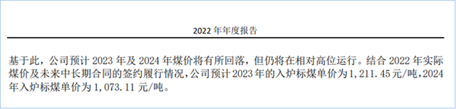 在2022年財(cái)報(bào)中,華能國際明確表示預(yù)計(jì)2023年及2024年煤價(jià)將有所回落,但仍將在相對(duì)高位運(yùn)行。并以南京電廠舉例,結(jié)合2022年實(shí)際煤價(jià)及未來中長(zhǎng)期合同的簽約履行情況,預(yù)計(jì)2023年的入爐標(biāo)煤?jiǎn)蝺r(jià)為1,211.45元/噸,2024年入爐標(biāo)煤?jiǎn)蝺r(jià)為1,073.11元/噸。