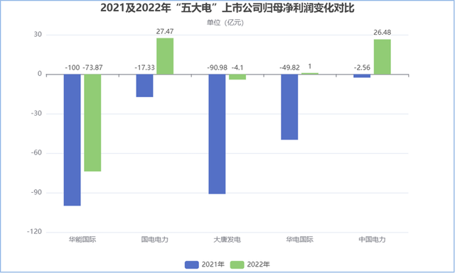 2022年,中國電力歸母凈利潤為26.48億元,2021年為-2.56億元,同比扭虧為盈;國電電力歸母凈利潤為27.47億元,2021年為-17.33億元,同比扭虧為盈;華電國際歸母凈利潤為1億元,2021年為-49.82億元,同比扭虧為盈;大唐發(fā)電歸母凈利潤為-4.1億元,2021年為-90.98億元,同比增長(zhǎng)95.49%;華能國際歸母凈利潤為-73.87億元,2021年為-100億元,虧損額度有所減少。