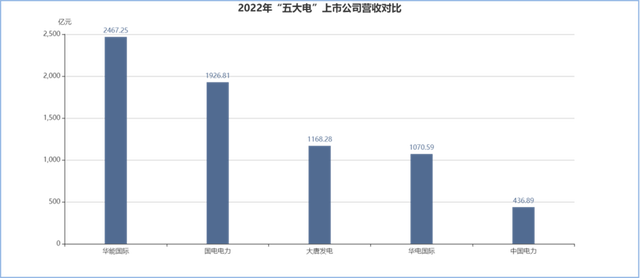 2022年,“五大電”旗下主體發(fā)電上市公司營收皆有增長(zhǎng),但座次沒有發(fā)生太大變化,華能國際以2467.25億營收依舊領(lǐng)銜。