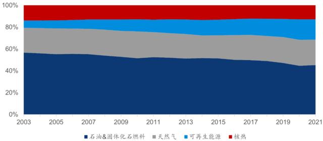 以歐美地區(qū)為代表,天然氣已經(jīng)成為眾多歐美國(guó)家的重要支柱能源。在歐盟27國(guó)中,天然氣作為直接燃料或發(fā)電能源,提供了該地區(qū)45%的化工能源需求、40%的鋼鐵能源需求、55%的食品飲料能源需求和40%的建筑能源需求。歐洲在過(guò)去二十年致力于推動(dòng)清潔能源的利用,將可再生能源的占比從7%提升至了19%,但主要取代的是煤炭和石油的份額,絲毫沒(méi)有動(dòng)搖天然氣在歐洲地區(qū)的重要地位,天然氣在所有能源中穩(wěn)定占據(jù)約23%的份額。