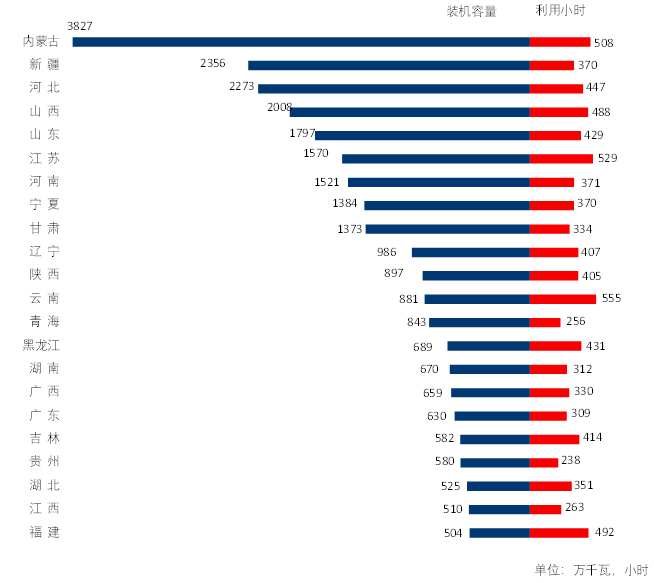 圖3 1-2月份風(fēng)電裝機較多省份風(fēng)電裝機容量和設(shè)備利用小時