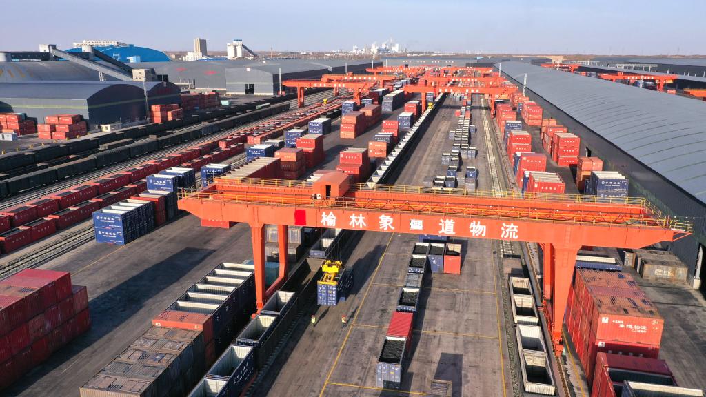 在榆林象道國際物流園集裝箱裝卸區(qū),工作人員在指揮裝卸外運(yùn)煤炭(無人機(jī)照片)。新華社記者 陶明 攝
