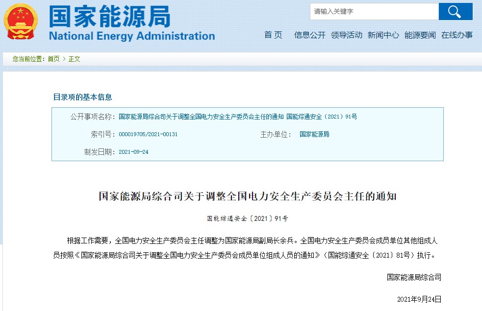 根據(jù)工作需要,全國電力安全生產(chǎn)委員會主任調(diào)整為國家能源局副局長余兵。全國電力安全生產(chǎn)委員會成員單位其他組成人員按照《國家能源局綜合司關(guān)于調(diào)整全國電力安全生產(chǎn)委員會成員單位組成人員的通知》(國能綜通安全〔2021〕81號)執(zhí)行。