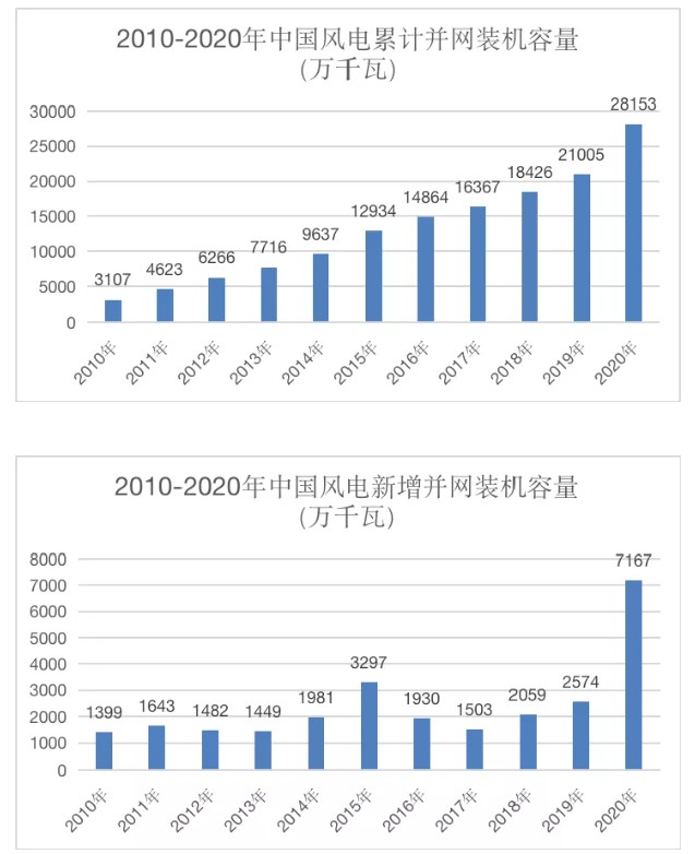 我國(guó)風(fēng)電并網(wǎng)裝機(jī)容量在2015年首次突破1億千瓦;2019年突破2億千瓦,用時(shí)4年;此次突破3億千瓦,用時(shí)僅2年。