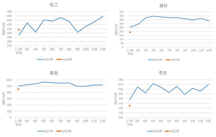 1-2月,化工行業(yè)用電量861億千瓦時(shí),同比增長4.9%,增速比上年同期回落9.4個(gè)百分點(diǎn);建材行業(yè)用電量478億千瓦時(shí),同比下降7.0%,增速比上年同期回落46.4個(gè)百分點(diǎn);黑色金屬冶煉行業(yè)用電量966億千瓦時(shí),同比下降5.0%,增速比上年同期回落23.8個(gè)百分點(diǎn);有色金屬冶煉行業(yè)用電量1111億千瓦時(shí),同比下降0.1%,增速比上年同期回落12.8個(gè)百分點(diǎn)。