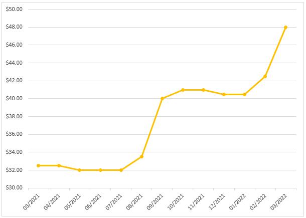 天然鈾現(xiàn)貨價格(2021.3-2022.3)