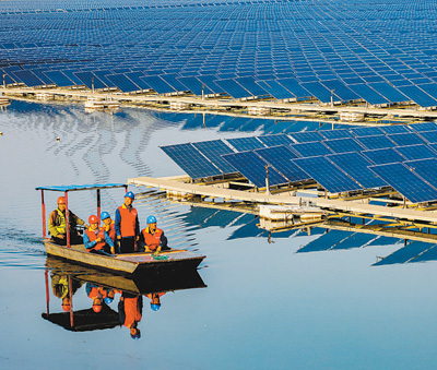 安徽淮北,電力工人在駕船巡檢“漁光互補”光伏發(fā)電站的設(shè)備。