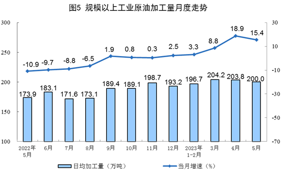 原油加工保持較快增長(zhǎng),增速有所回落。5月份,加工原油6200萬噸,同比增長(zhǎng)15.4%,增速比4月份回落3.5個(gè)百分點(diǎn),日均加工原油200.0萬噸。1—5月份,加工原油30263萬噸,同比增長(zhǎng)9.8%。