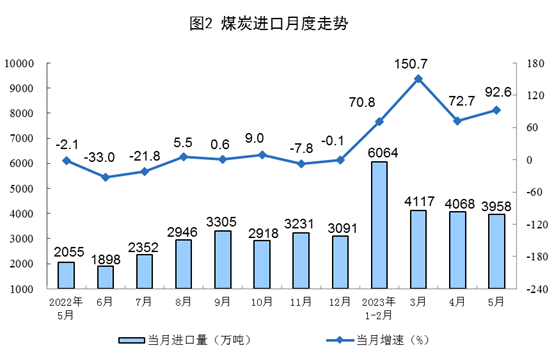 原煤生產(chǎn)保持穩(wěn)定,進(jìn)口持續(xù)高位增長(zhǎng)。5月份,生產(chǎn)原煤3.9億噸,同比增長(zhǎng)4.2%,增速比4月份放緩0.3個(gè)百分點(diǎn),日均產(chǎn)量1243萬噸。進(jìn)口煤炭3958萬噸,同比增長(zhǎng)92.6%,增速比4月份加快19.9個(gè)百分點(diǎn)。