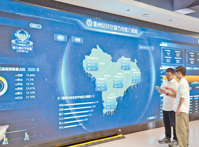 浙江省衢州市能源大數(shù)據(jù)中心,國網(wǎng)浙江衢州供電公司員工利用數(shù)字化平臺(tái)監(jiān)測(cè)全市居民空調(diào)節(jié)電情況。