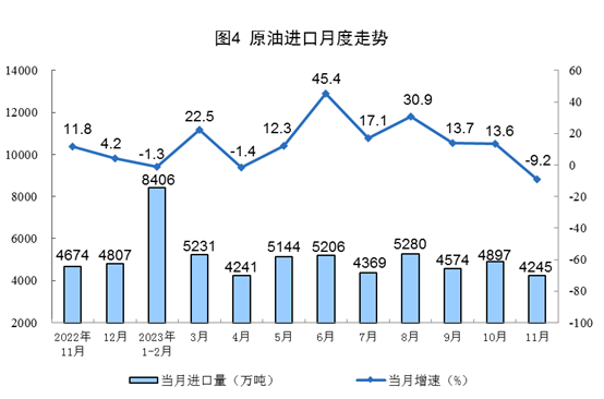 原油生產(chǎn)增速加快,進(jìn)口增速由增轉(zhuǎn)降。11月份,生產(chǎn)原油1720萬噸,同比增長2.6%,增速比10月份加快2.1個百分點(diǎn),日均產(chǎn)量57.3萬噸。進(jìn)口原油4245萬噸,同比下降9.2%,10月份為增長13.6%。