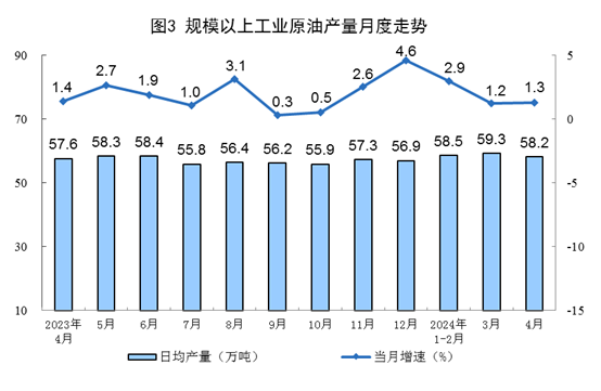 原油生產(chǎn)平穩(wěn)增長,進(jìn)口由降轉(zhuǎn)增。4月份,規(guī)上工業(yè)原油產(chǎn)量1747萬噸,同比增長1.3%,增速比3月份加快0.1個(gè)百分點(diǎn);日均產(chǎn)量58.2萬噸。進(jìn)口原油4472萬噸,同比增長5.9%。