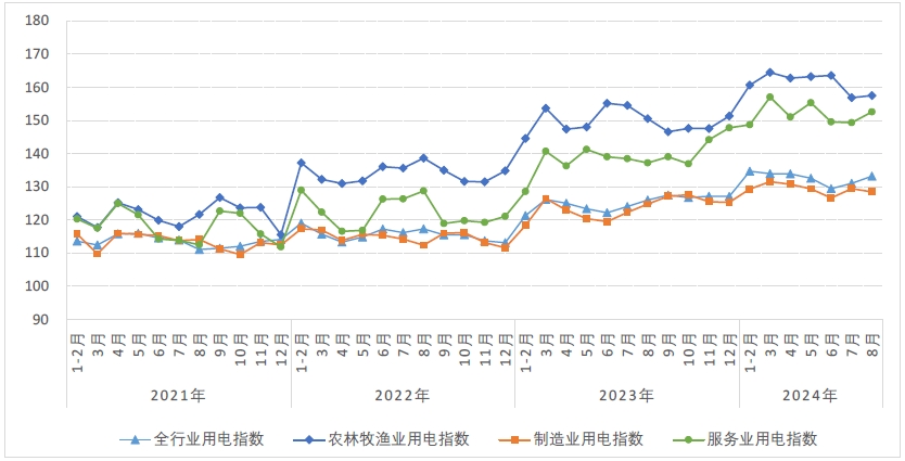8月,農(nóng)林牧漁業(yè)用電指數(shù)為157.5,比2020年基期增長了57.5%,年均增長12.0%,同比增長4.6%,同比增速比上月回升3.1個百分點(diǎn)。