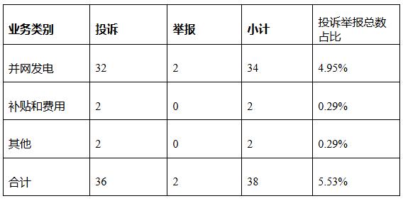 新能源和可再生能源行業(yè)排在第二位,數(shù)量為38件、占投訴舉報總數(shù)的5.53%,主要集中在并網(wǎng)發(fā)電方面。