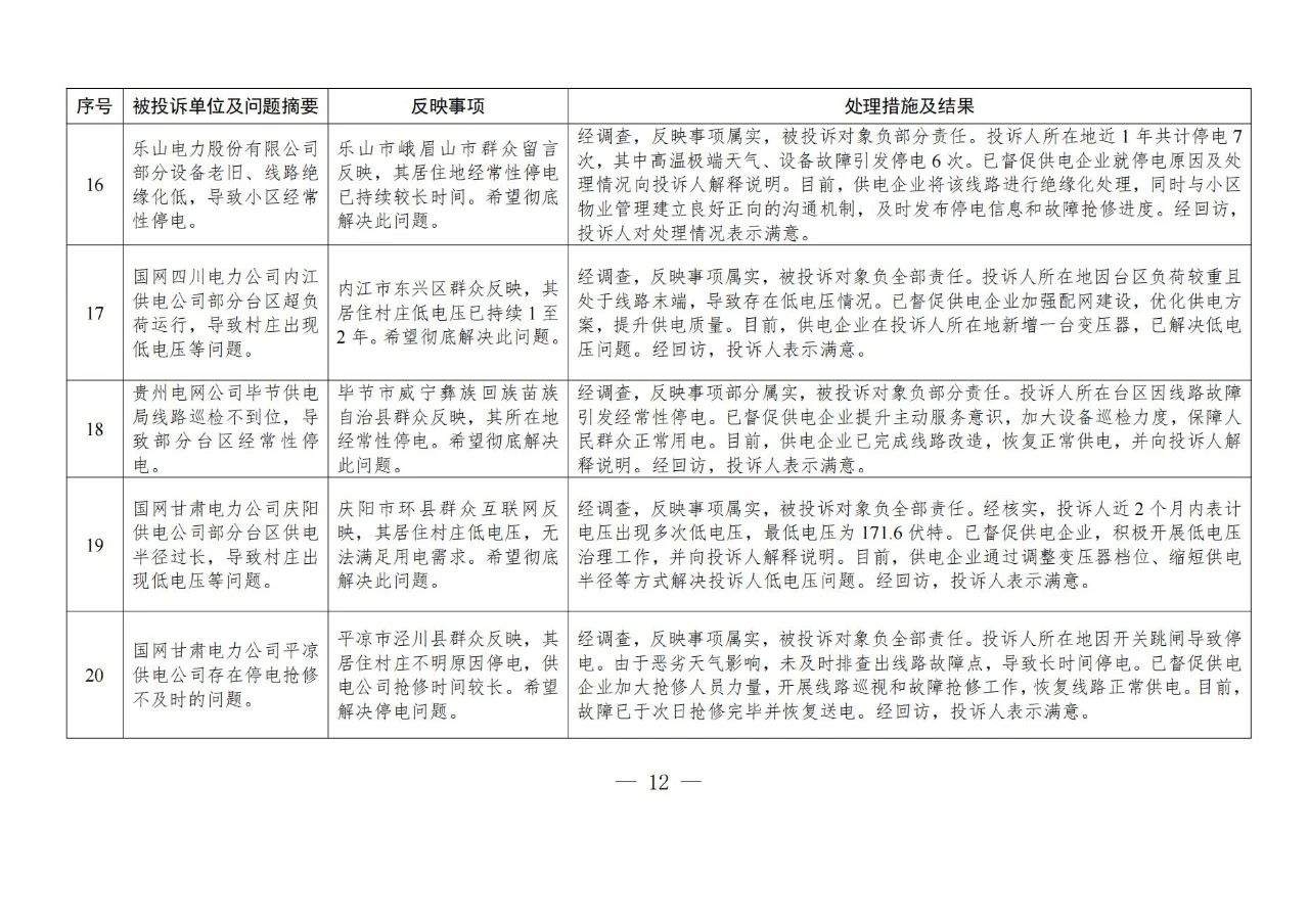 針對群眾反映的投訴舉報,國家能源局派出機(jī)構(gòu)嚴(yán)格按照有關(guān)法規(guī)政策規(guī)定進(jìn)行處理。一是督促供電企業(yè)進(jìn)一步規(guī)范用電報裝管理,強(qiáng)化業(yè)擴(kuò)報裝全流程管控,嚴(yán)格按照規(guī)定時限完成裝表接電;二是要求供電企業(yè)加強(qiáng)設(shè)備隱患排查整治,強(qiáng)化停電搶修管理,合理規(guī)劃計劃停電,增加搶修資源投入,提升設(shè)備管控和停電搶修能力,切實提高供電可靠性;三是通過行政處罰、監(jiān)管約談、責(zé)令整改等方式,糾正有關(guān)企業(yè)違法違規(guī)行為,維護(hù)公平公正的市場秩序和群眾合法權(quán)益;四是通過解釋說明、澄清事實,消除群眾誤解。(2024年11月12398熱線典型投訴舉報事項具體處理情況見附件2)
